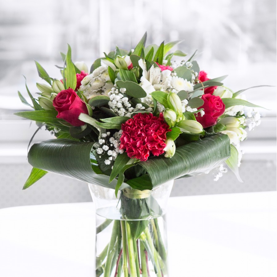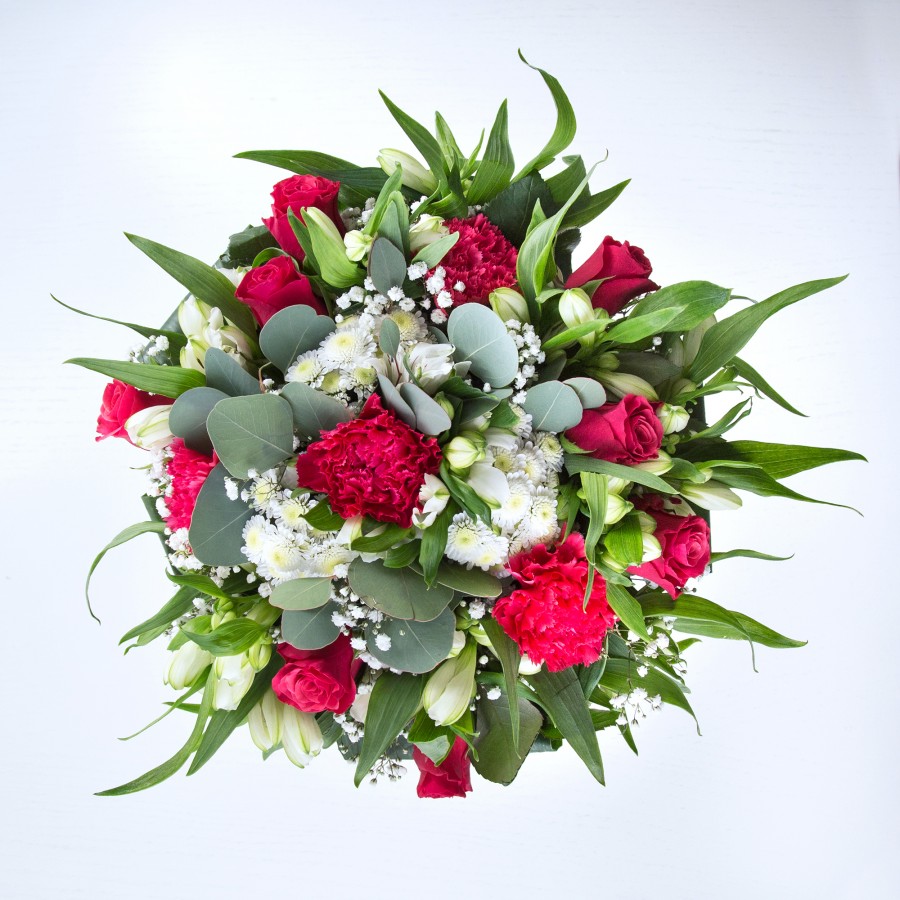 Embrace the luxurious elegance of our unique bouquet, combining white chrysanthemums, delicate gypsophila, striking red roses, vibrant carnations, pristine white alstroemeria, and lush aspidistra leaves. Each flower is hand-selected to ensure exceptional freshness and quality.