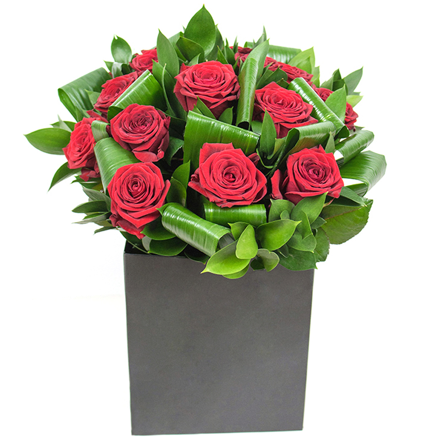 - High-Quality Flowers: Hand-selected, fresh red roses, aspidistra, and ruscus.